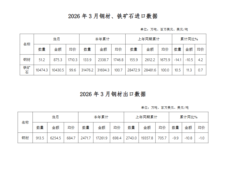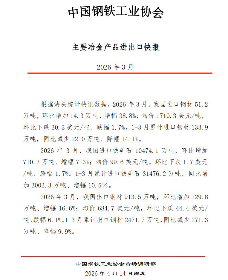 2026年3月主要冶金產(chǎn)品進(jìn)出口快報(bào)