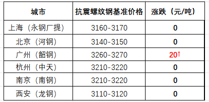 截至午間,國(guó)內(nèi)部分市場(chǎng)螺紋鋼(抗震)基價(jià)如下:上海市場(chǎng)3160-3170元/噸;北京市場(chǎng)3140-3150元/噸;廣州市場(chǎng)3260-3270元/噸;杭州市場(chǎng)3210-3220元/噸;南京市場(chǎng)3210-3220元/噸;西安市場(chǎng)3110-3120元/噸。環(huán)比來(lái)看,截至午間收盤(pán),全國(guó)主要市場(chǎng)一線品牌價(jià)格多數(shù)持平,個(gè)別調(diào)高。